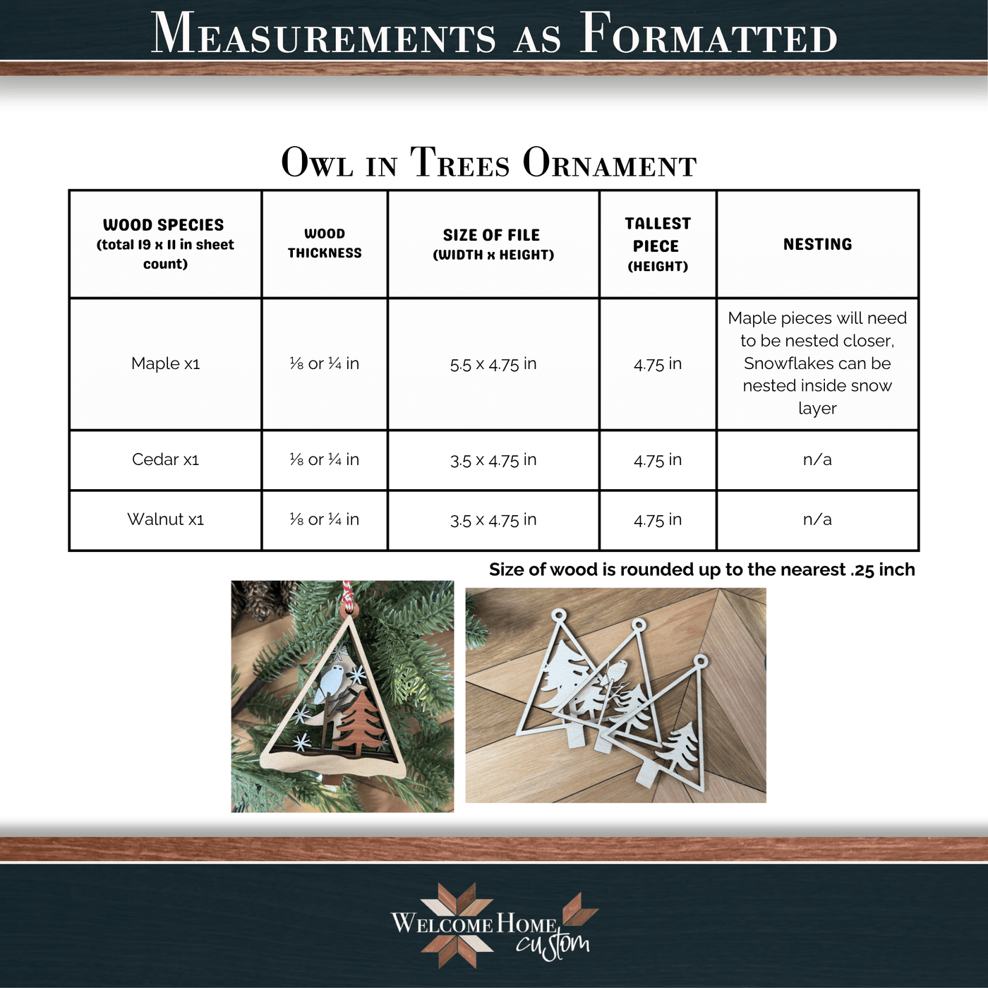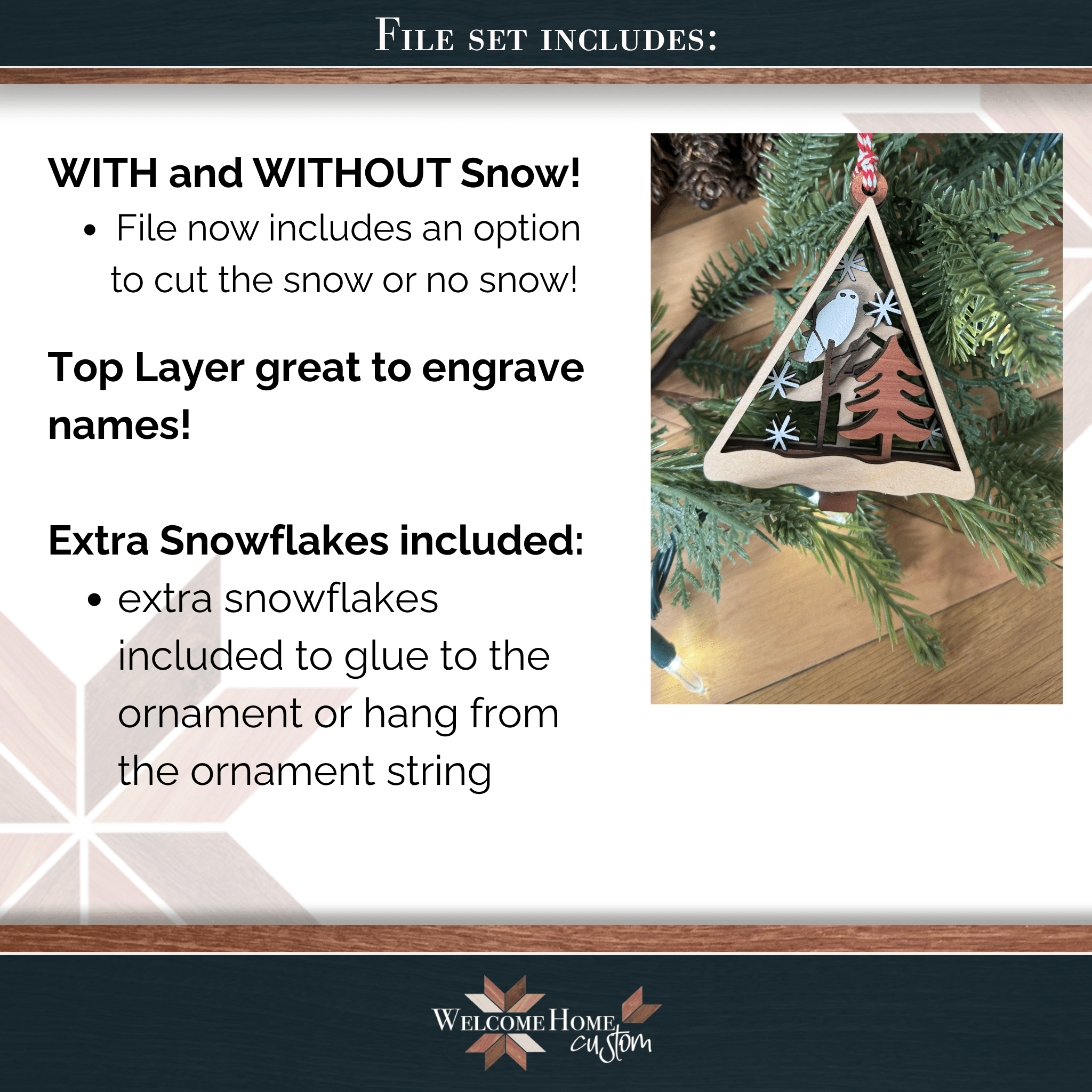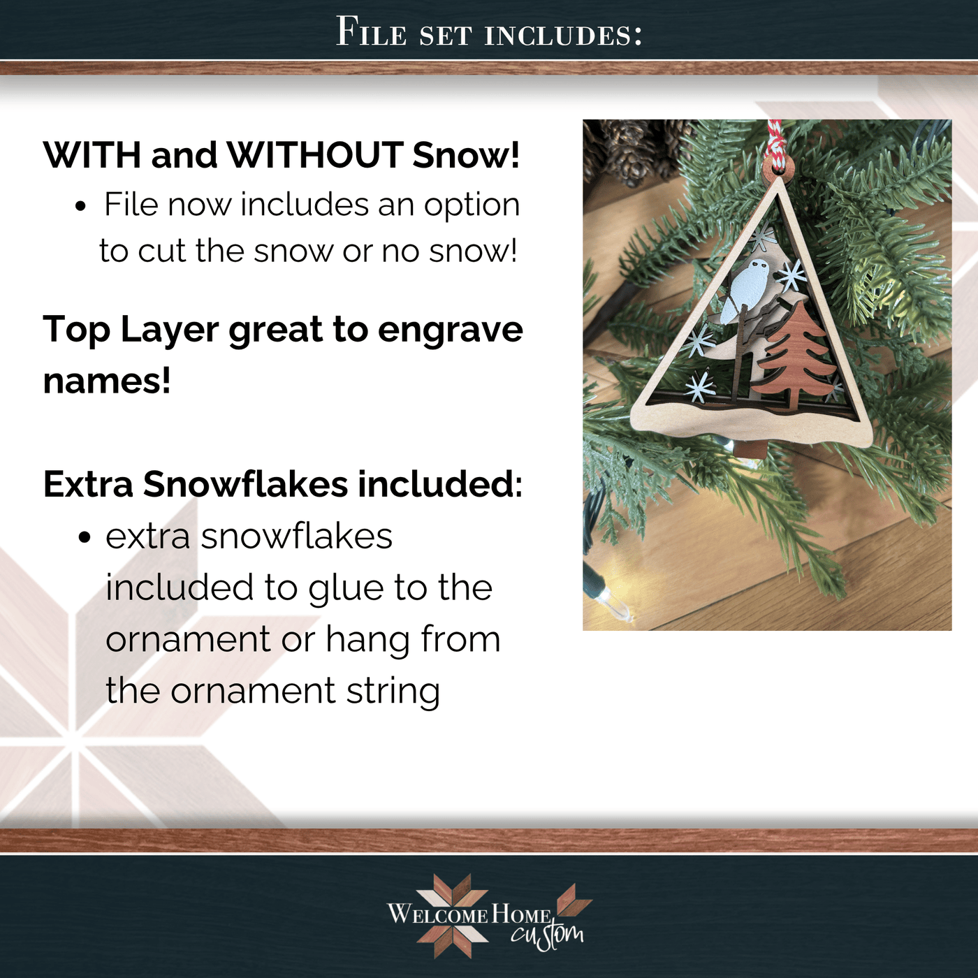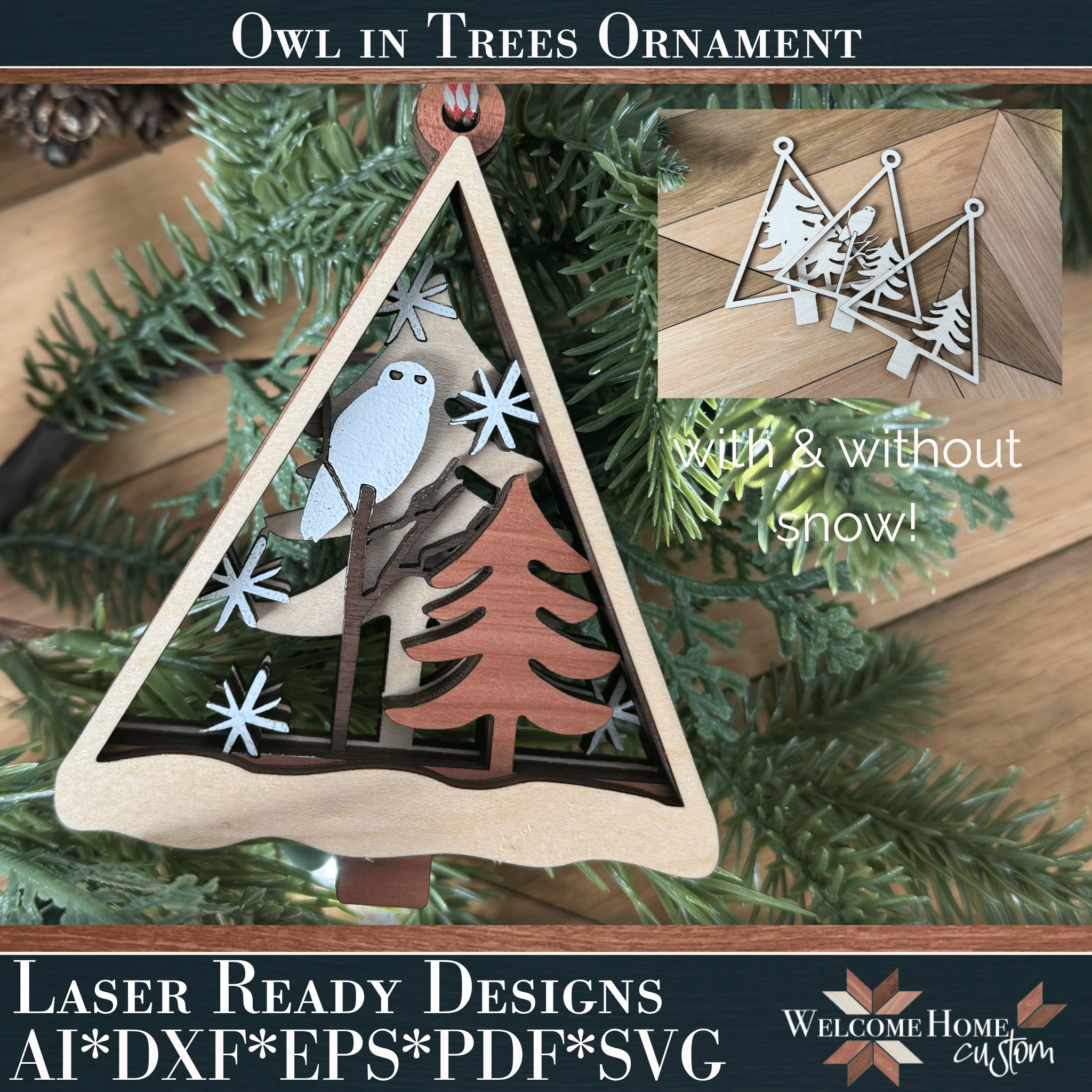 Elevate your holiday decor with our Owl Ornament laser cut files. The intricate design features an owl and enchanting trees, with the option for snow for a touch of winter magic or no snow if you prefer. Perfect for personalization at craft shows or in-store, this versatile ornament works with most lasers.