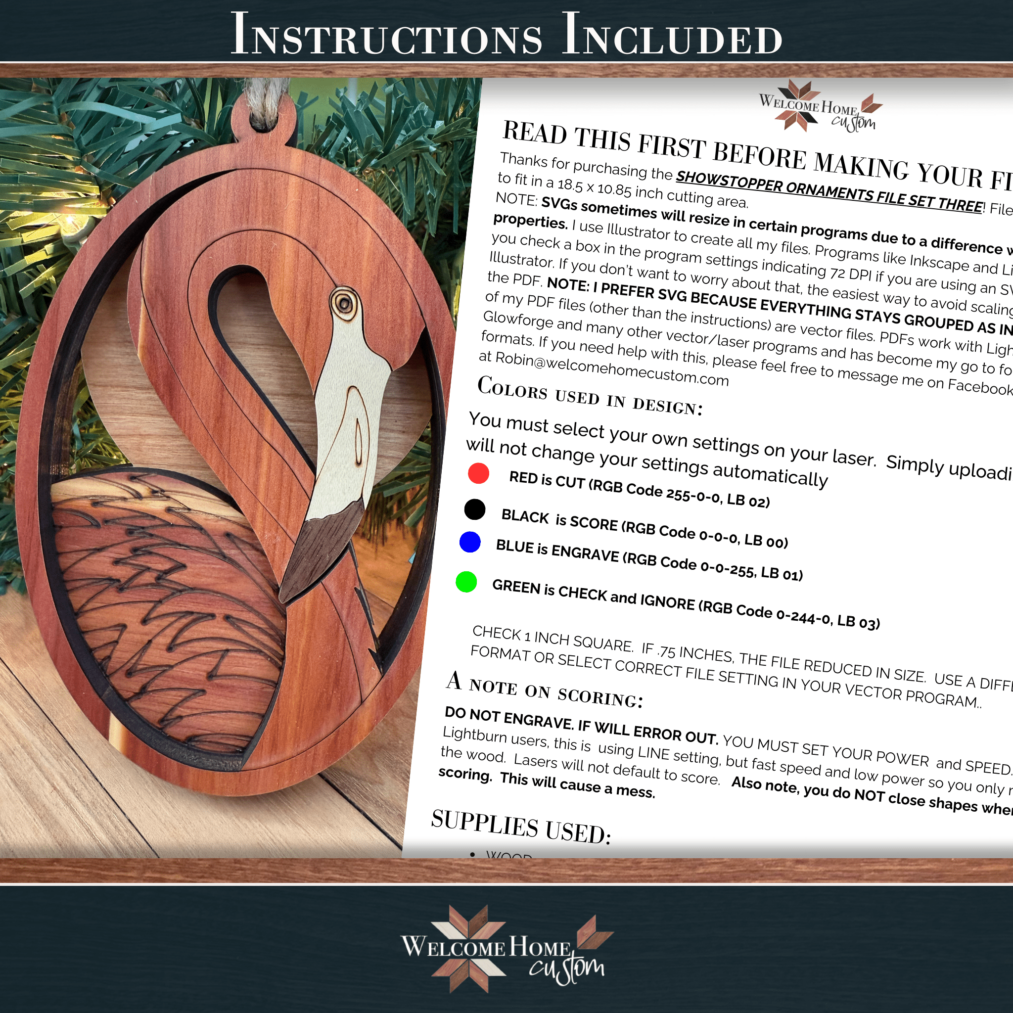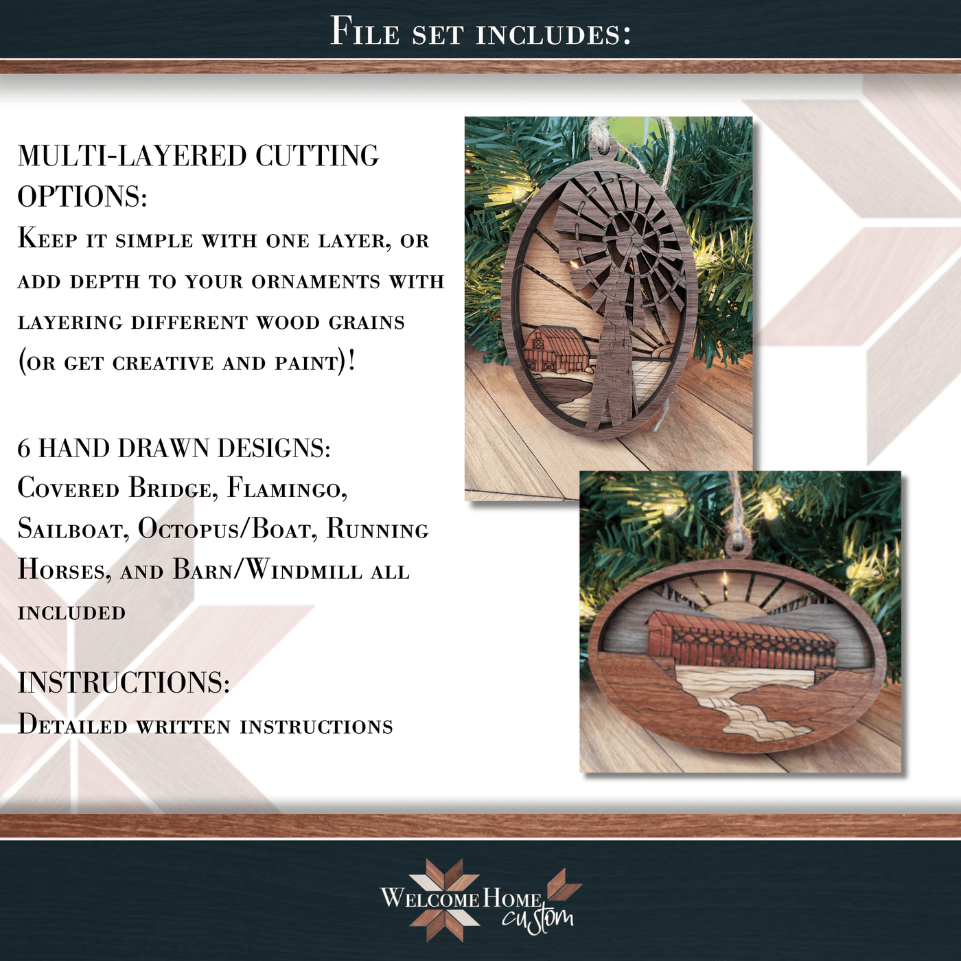 Welcome Home Custom is thrilled to offer you our favorite showstoppers in an ornament option! Our collection includes 6 unique hand drawn designs: Flamingo, Sailboat, Octopus, Windmill, Running Horses, and Covered Bridge. Perfect for displaying alongside your full-sized or DIY showstoppers, these ornaments can be crafted with a single layer or multiple woods for a truly eye-catching finish.